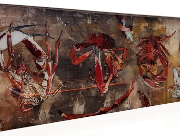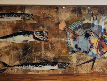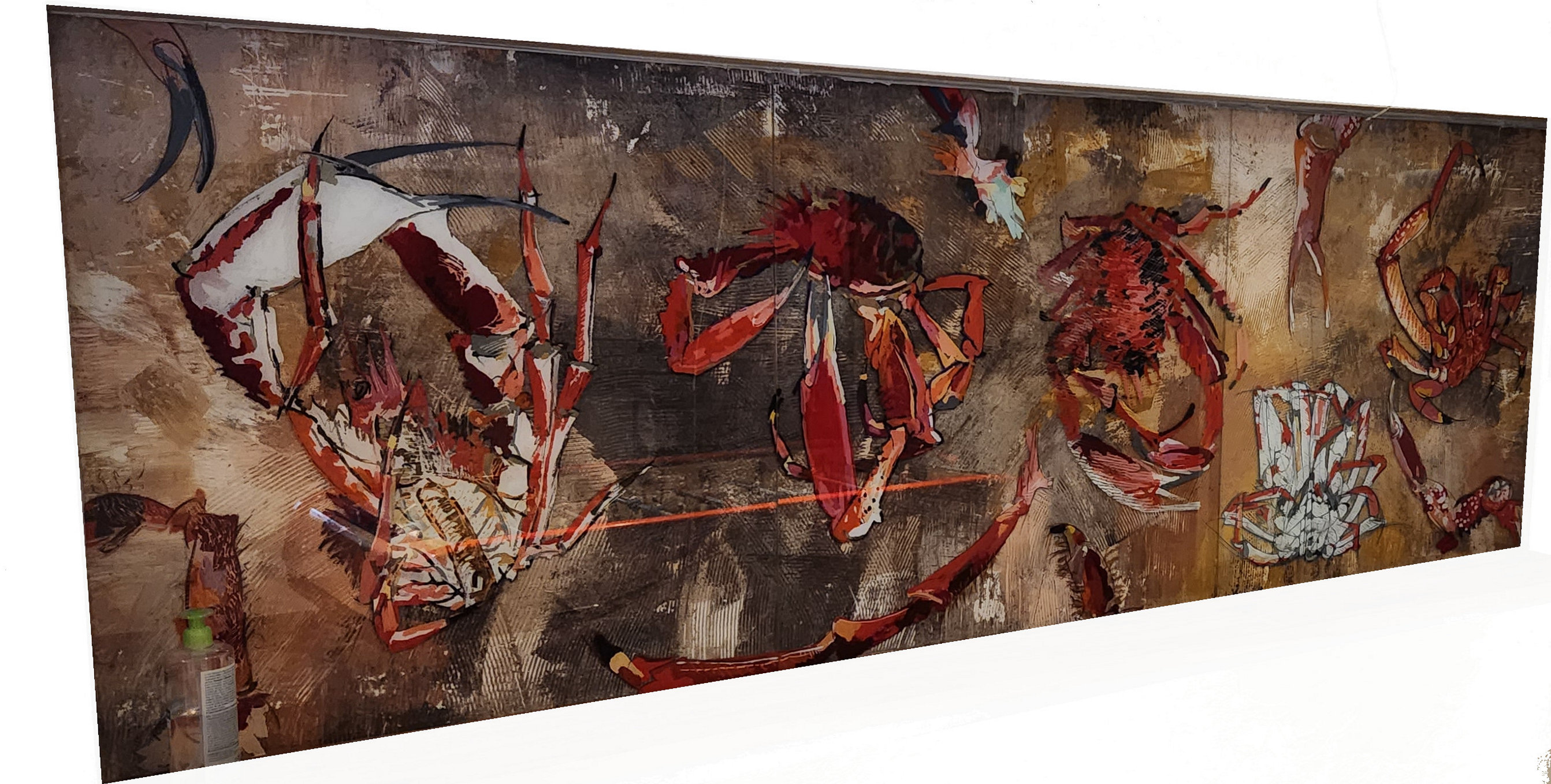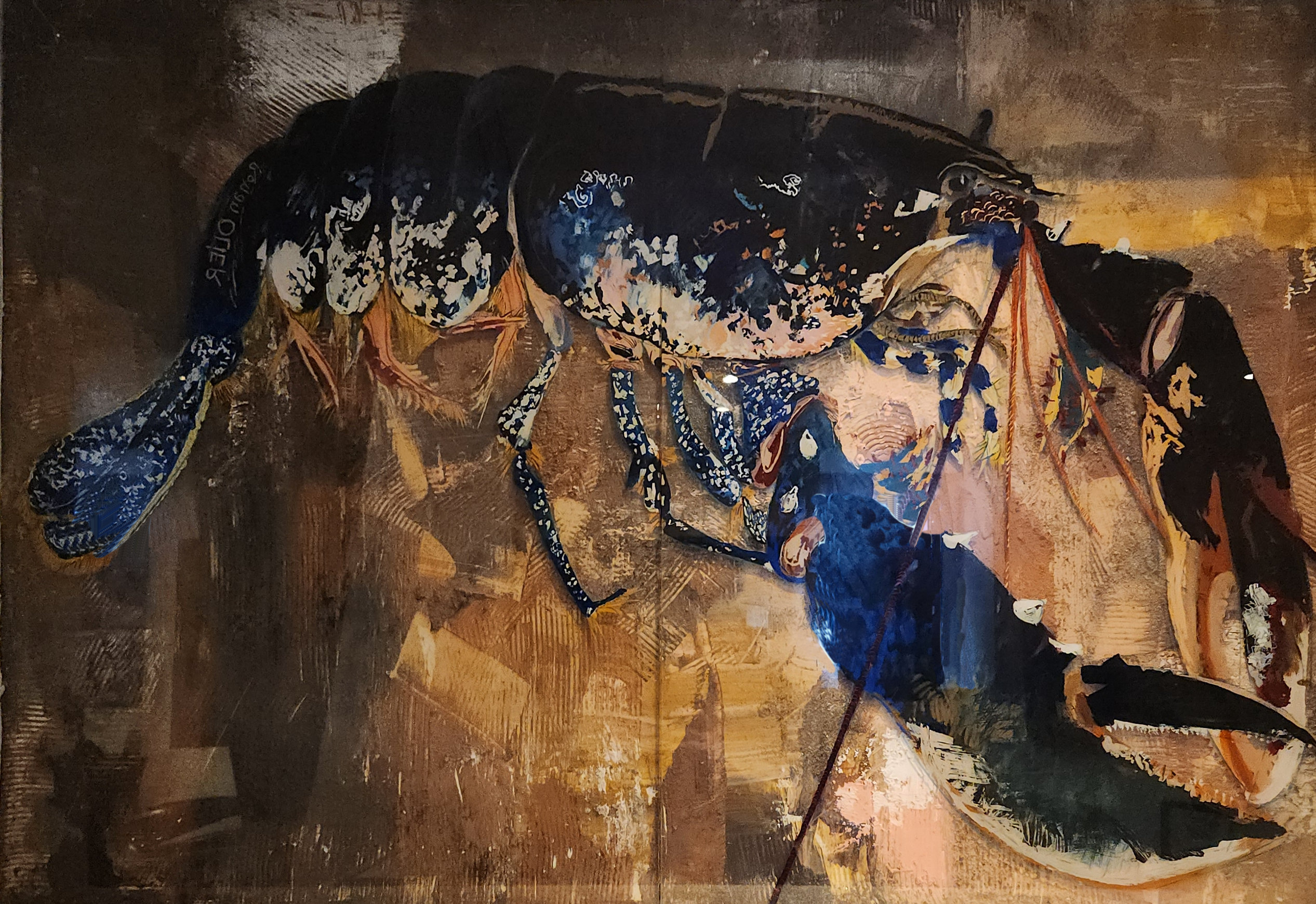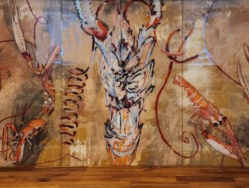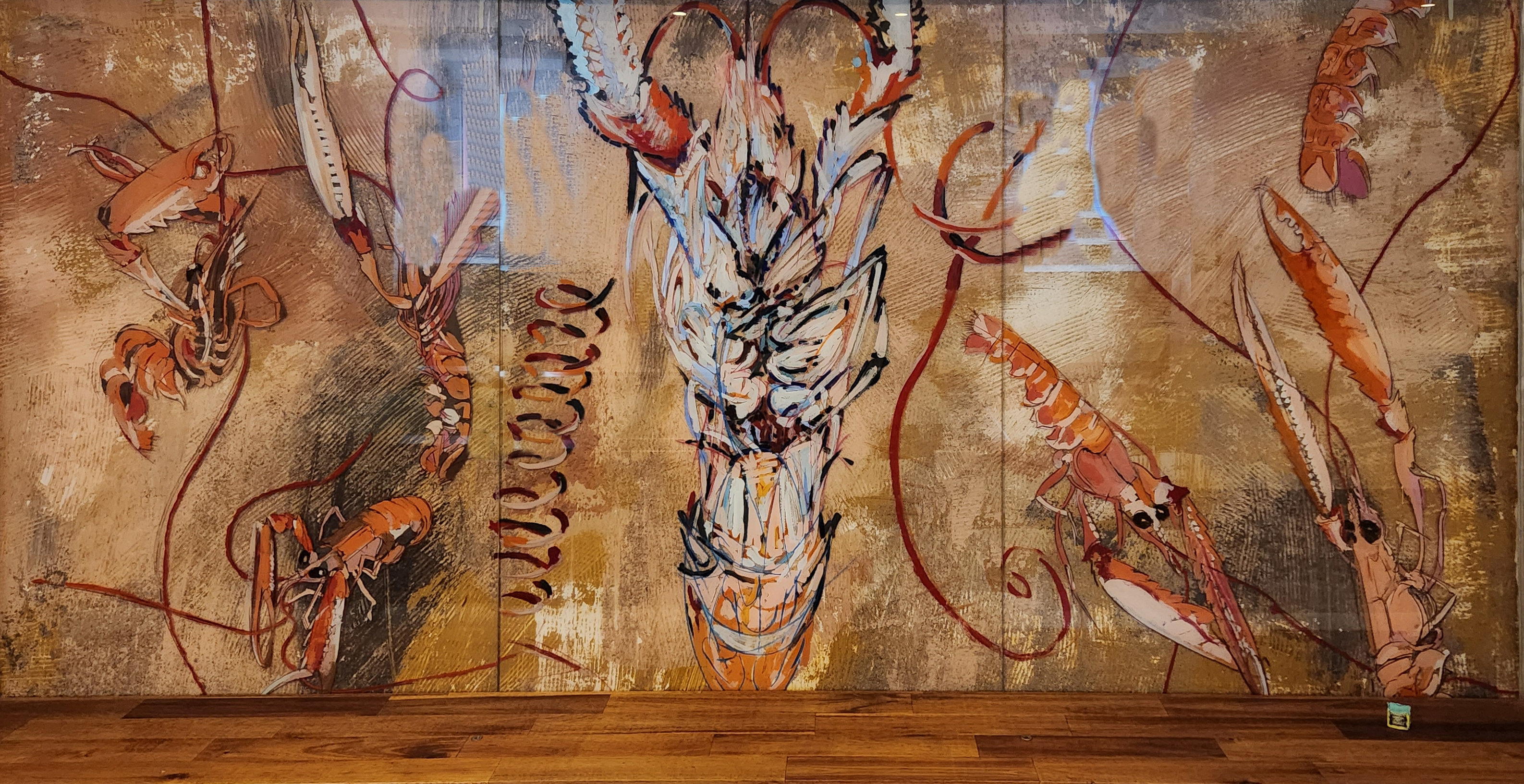 Ronan OLIER (1949-2020) – Importante fresque en verre peint à décor d’un homard bleu, araignées, langoustines, roussettes et anguilles. Pouvant se présenter en plusieurs éléments par 2 ou 3 panneaux de verre. Ancienne décoration du restaurant « La Tulipe » à Plomeur. Dim° pour le homard (2 plaques en verre : 83,5 x 129 cm). (photos prises à l’intérieur du bar, un panneau accidenté au démontage)