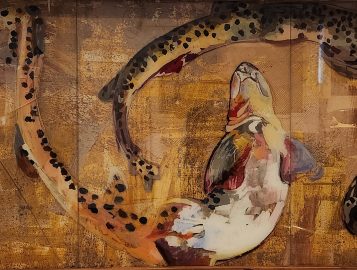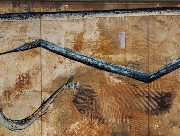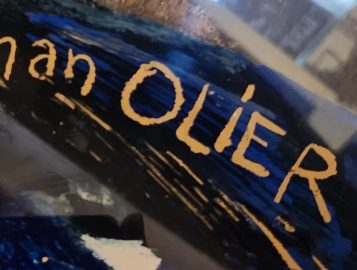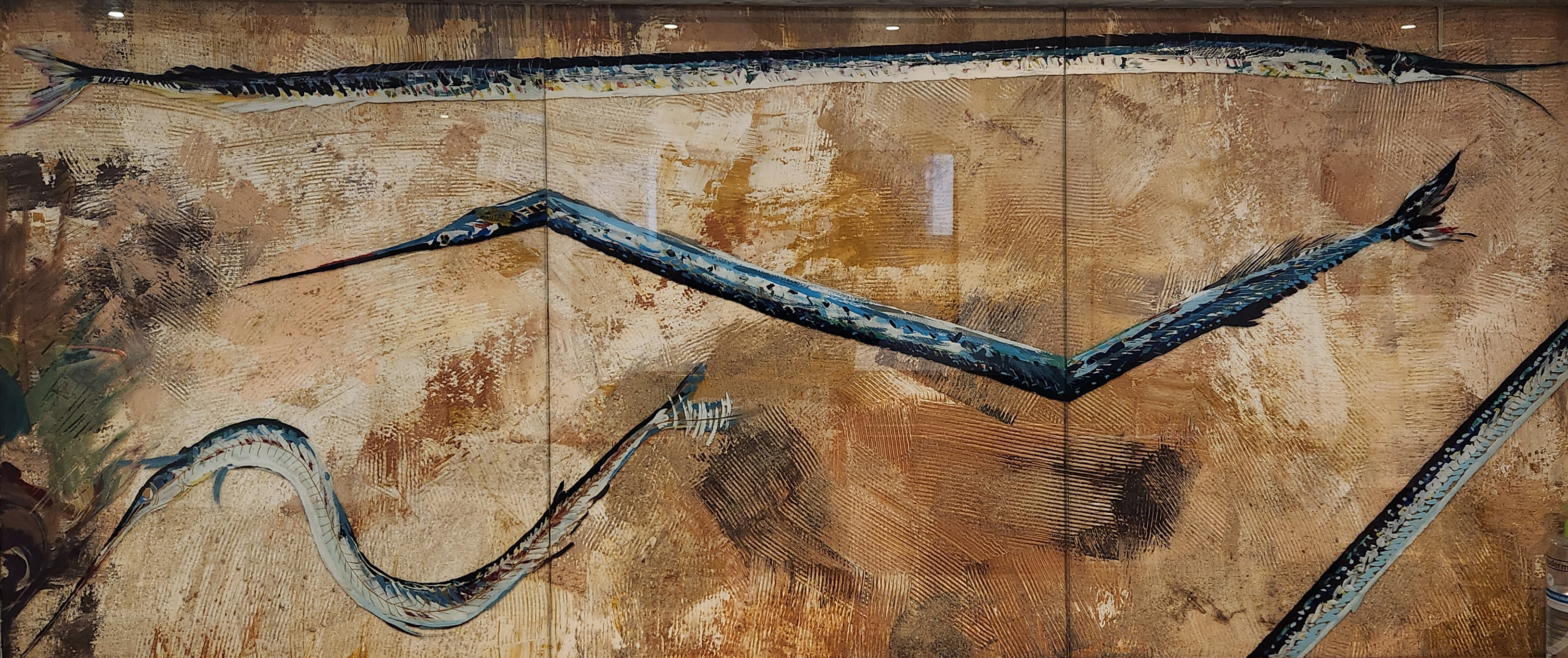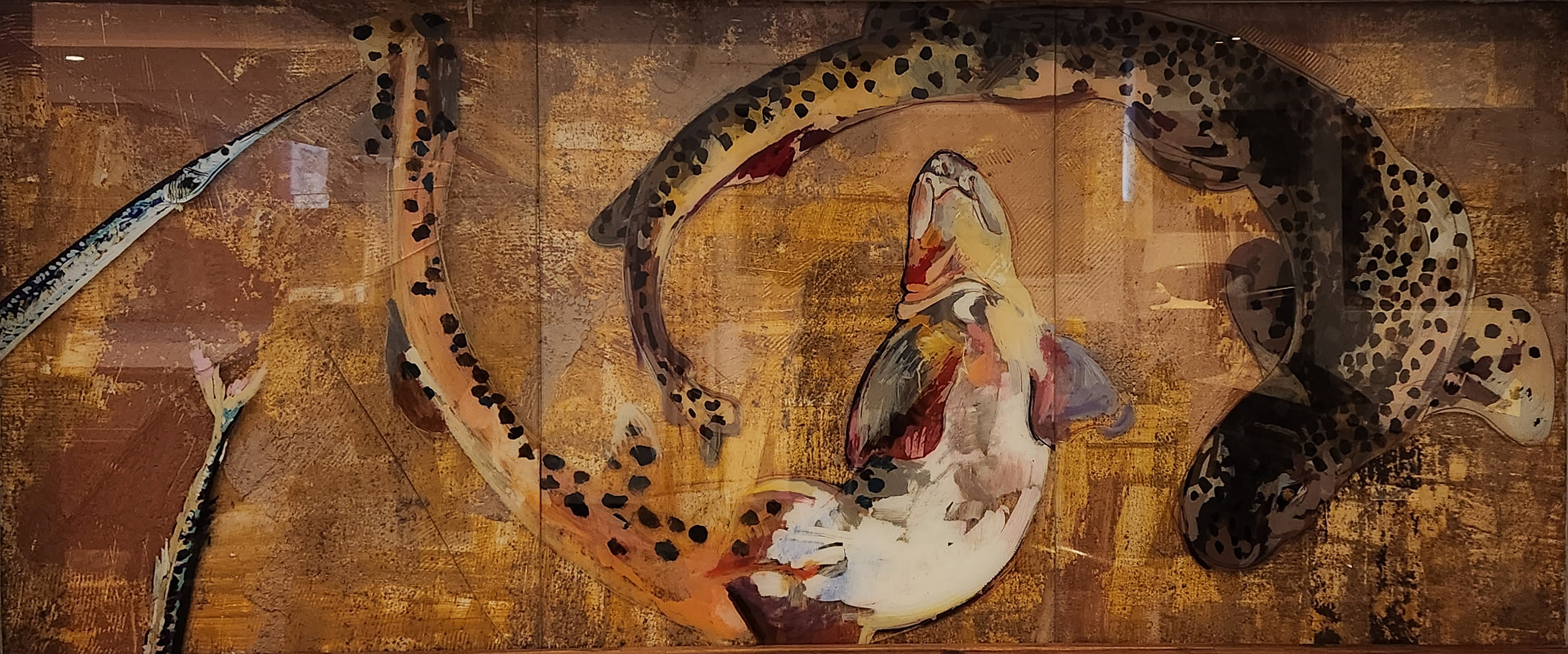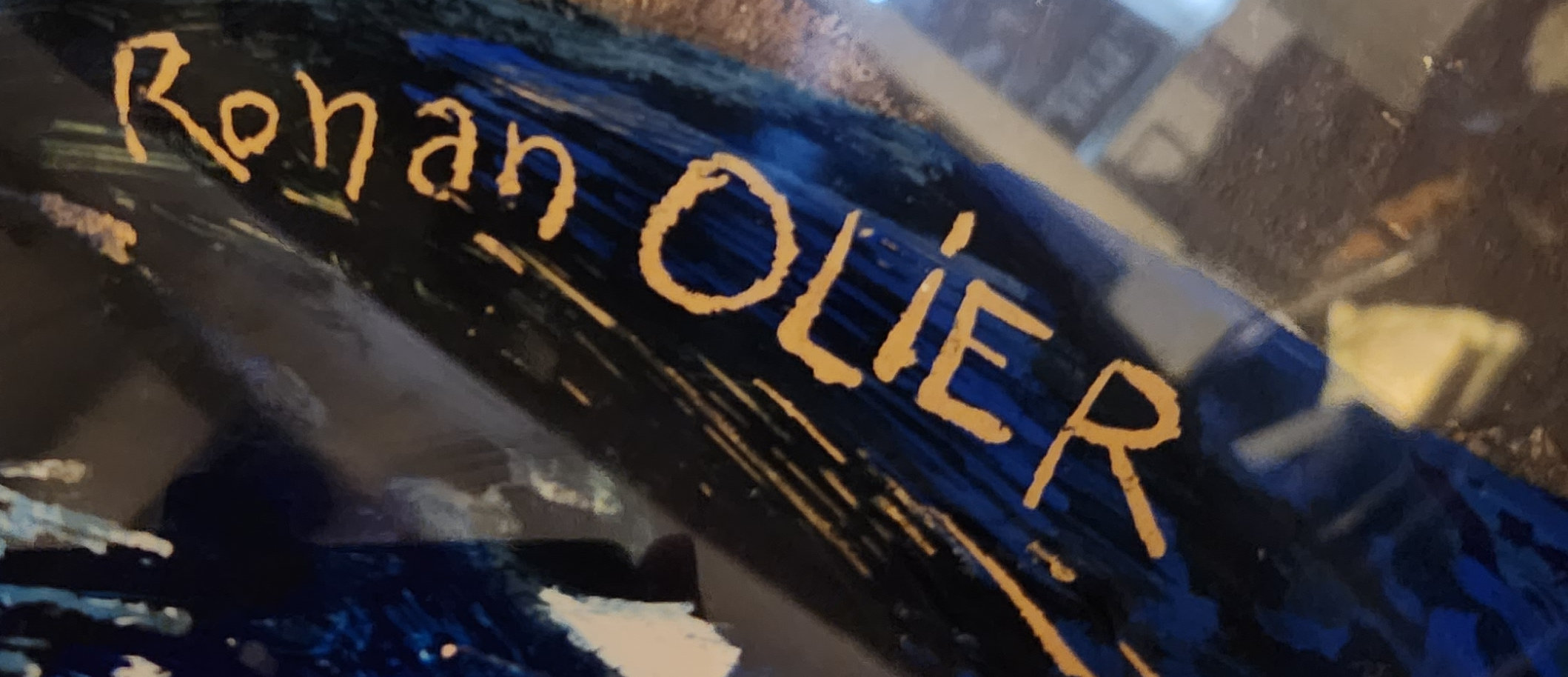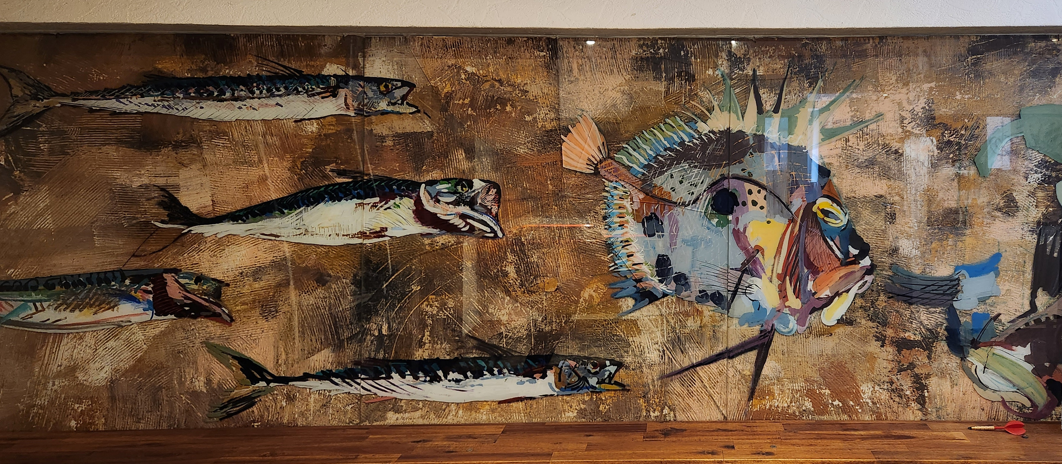 Ronan OLIER (1949-2020) – Importante fresque en verre peint à décor d’un homard bleu, araignées, langoustines, roussettes et anguilles. Pouvant se présenter en plusieurs éléments par 2 ou 3 panneaux de verre. Ancienne décoration du restaurant « La Tulipe » à Plomeur. Dim° pour le homard (2 plaques en verre : 83,5 x 129 cm). (photos prises à l’intérieur du bar, un panneau accidenté au démontage)