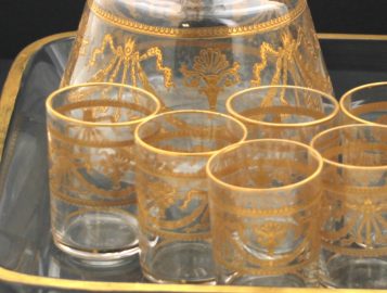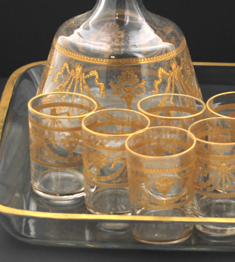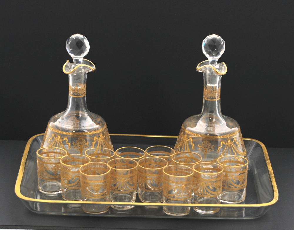 Service à liqueur fin XIXème en cristal rehaussé or comprenant un plateau 31 x 21,5 cm env., une paire de carafes avec bouchons et 12 verres à liqueur