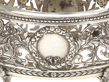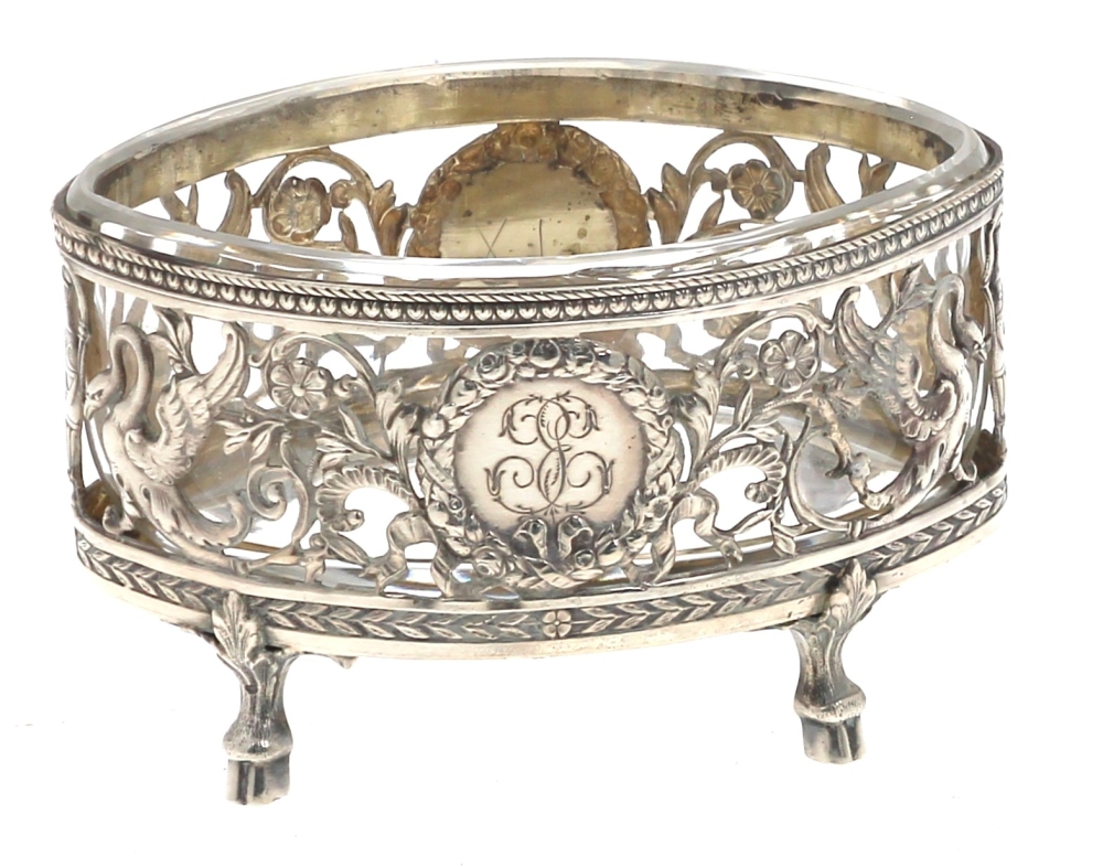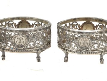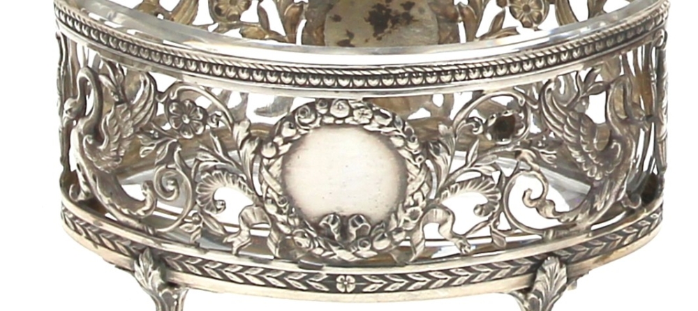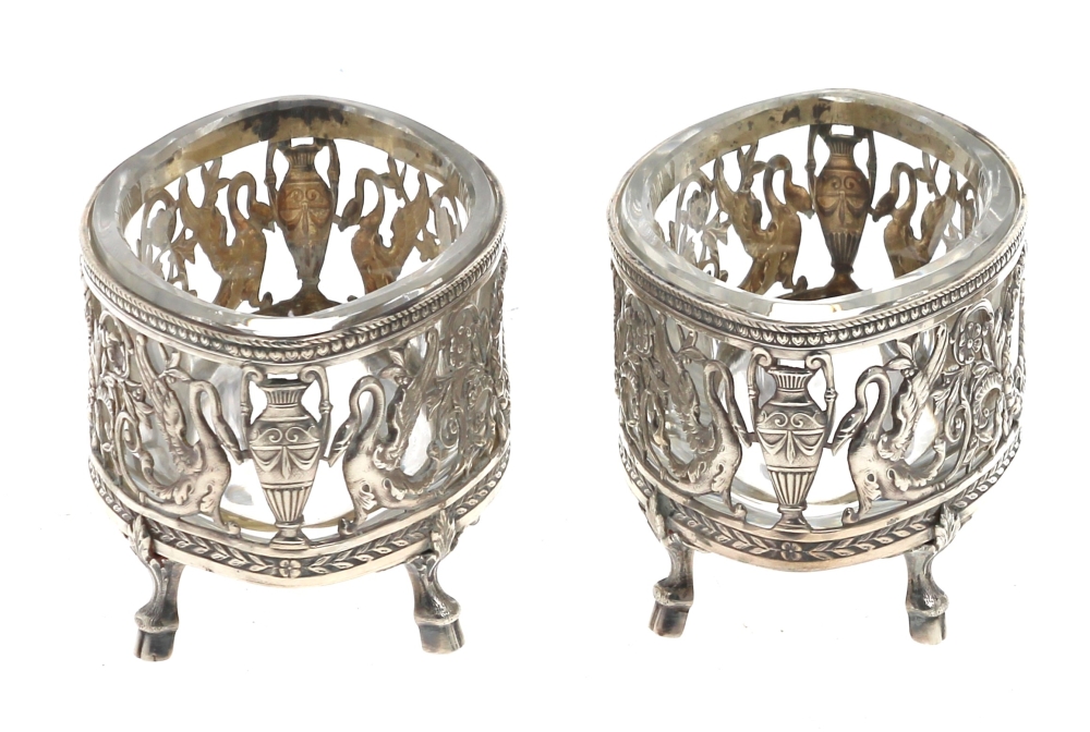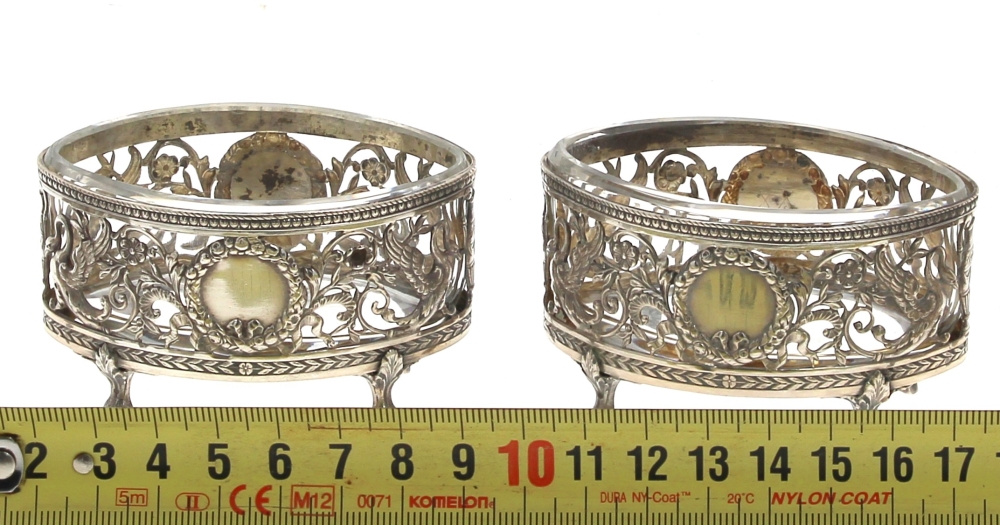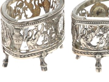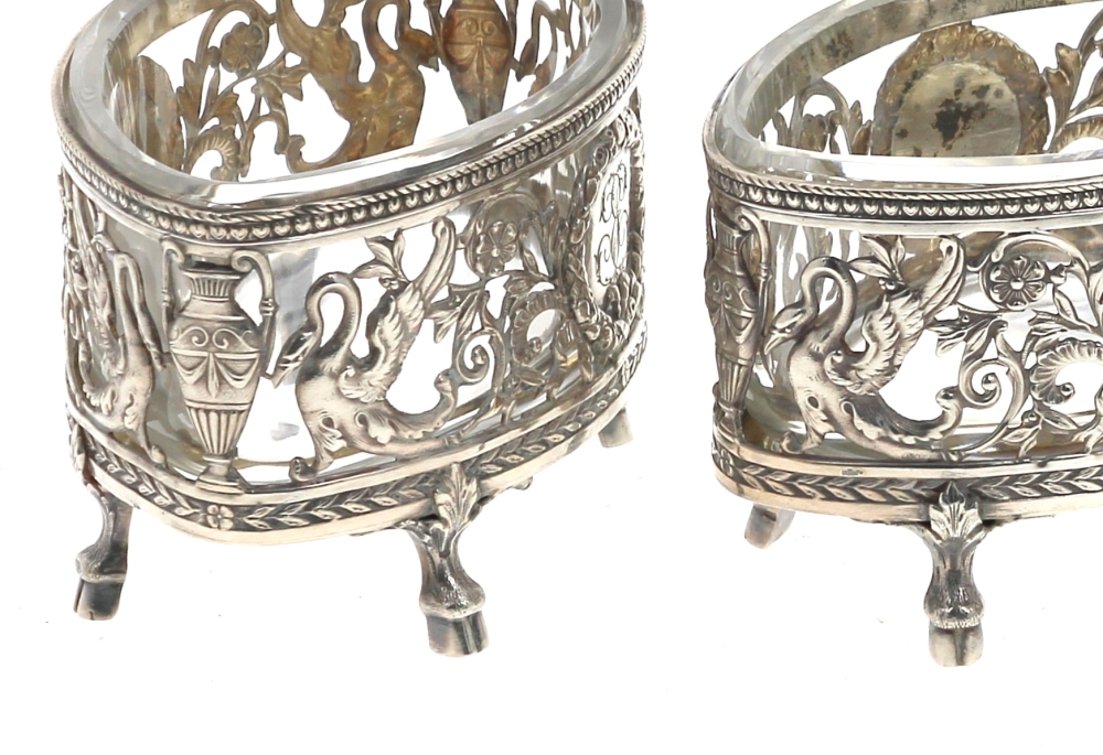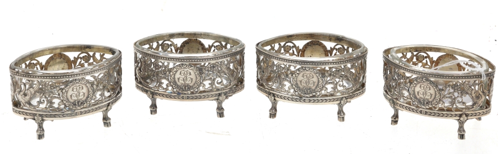 Suite de 4 salerons cages en argent forme navette, poinçon minerve, chiffrés, décor de style Louis XVI, intérieurs en verre. Poids de l’argent 130 grs