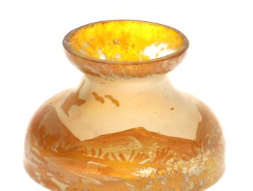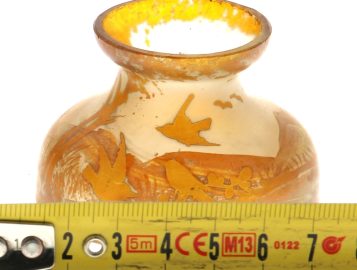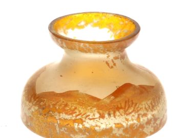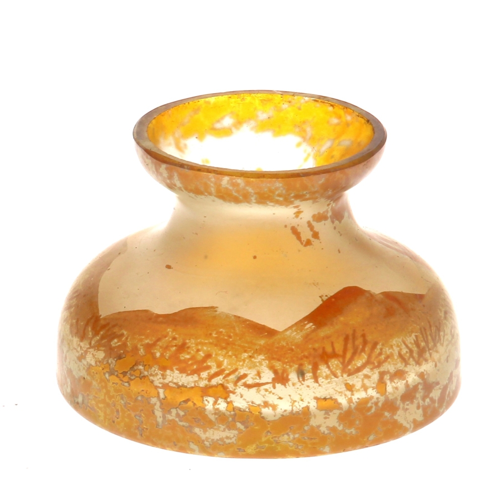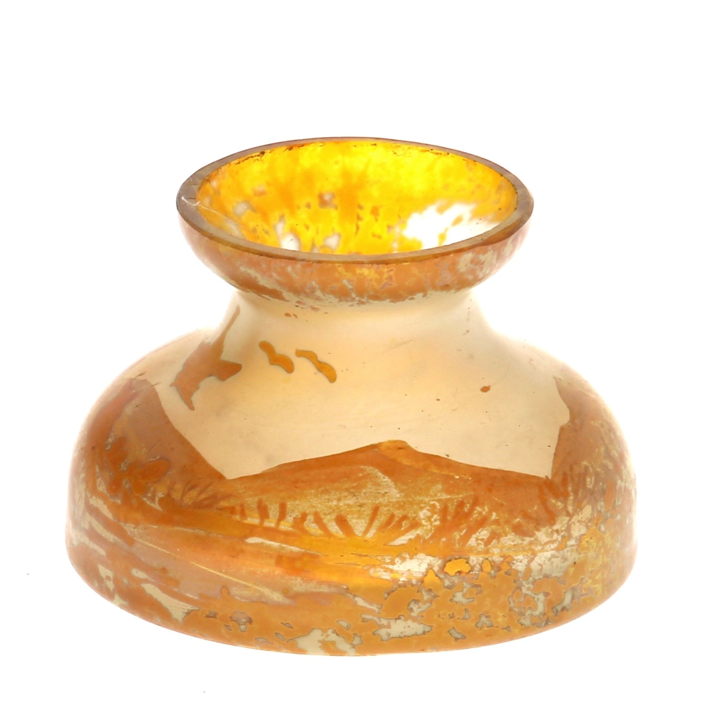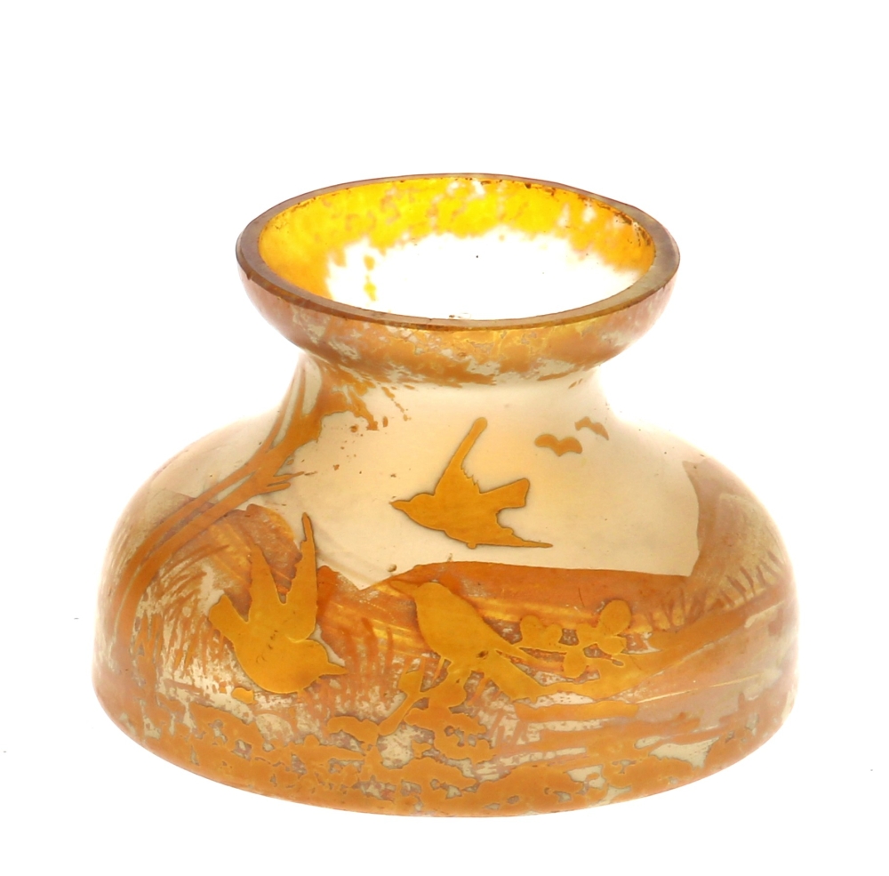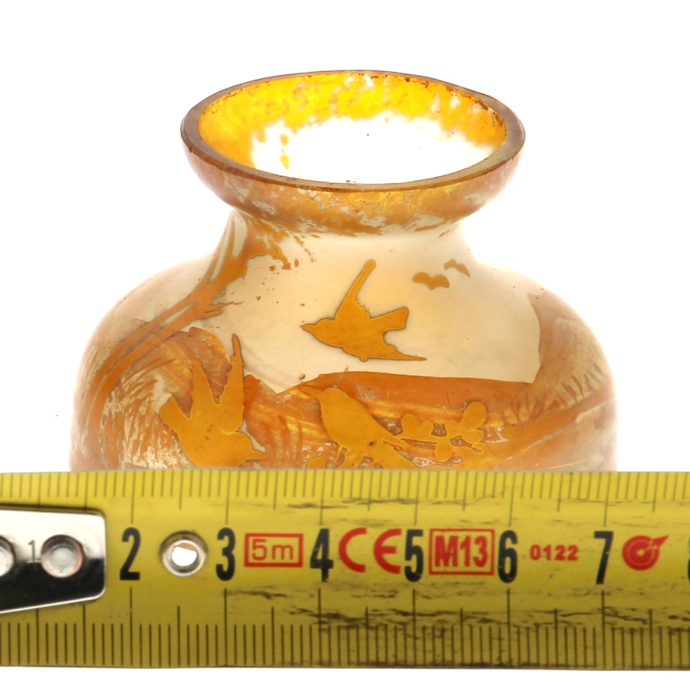Vase miniature en verre décor d’oiseaux dans un paysage dans les tons ambrés vers 1900, H. 4,5 cm, diam à la base 6 cm