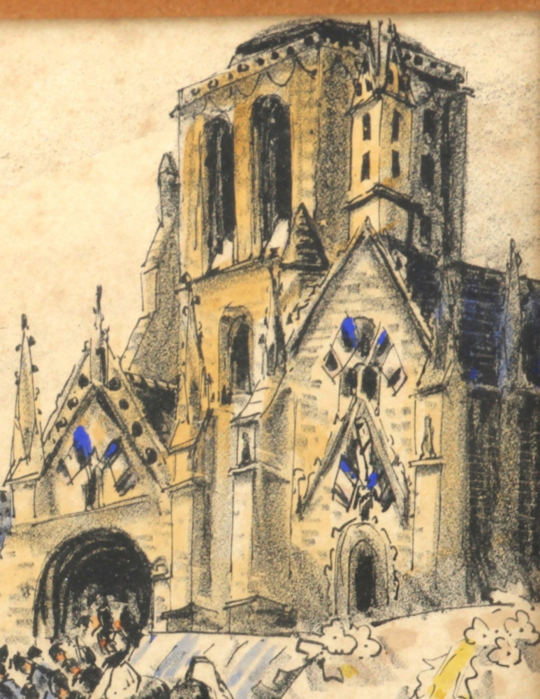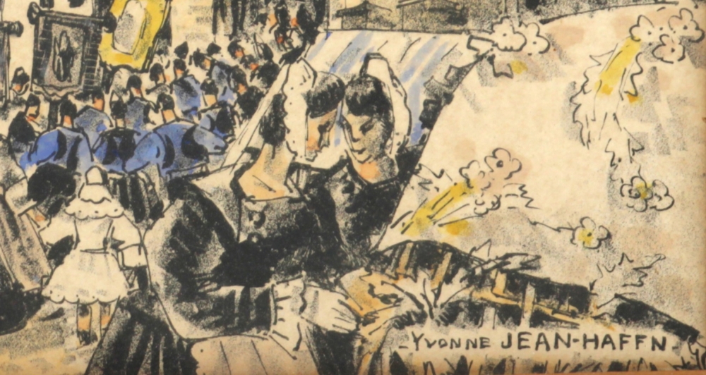 Yvonne JEAN-HAFFEN (1895-1993) « Jour de Pardon à Locronan », gravure rehaussée à l’aquarelle, signée bas droite, 17,5 x 24 cm