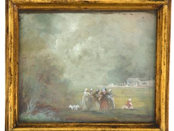 Ecole Française du XVIIIème "Animation dans le parc du château", miniature peint à l'aquarelle, non…