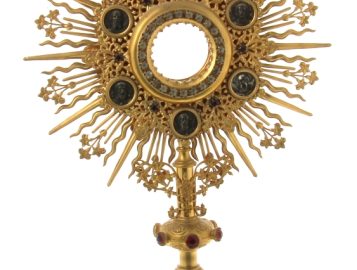 OSTENSOIR en métal doré et métal argenté, motif rayonnant à décor de fleurs, surmonté d'un…