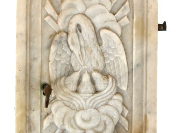 Petite porte de tabernacle en marbre sculpté à décor d'un symbole christique figurant un pélican…
