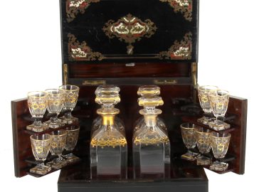 Cave à liqueur Napoléon III en bois noirci et marqueterie en laiton et nacre, contenant…