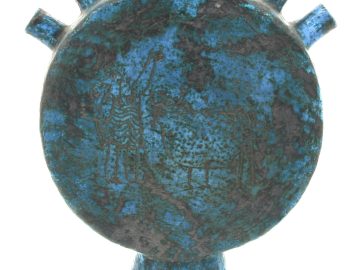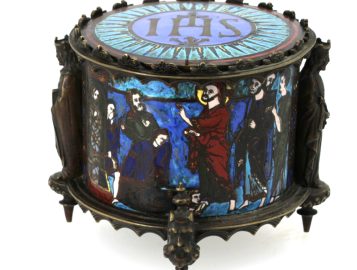 Boîte à hosties en bronze patiné et émaux cloisonnés, LIMOGES XIXème. Décor de personnages bibliques…