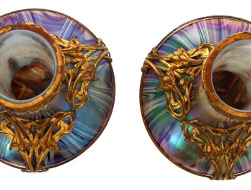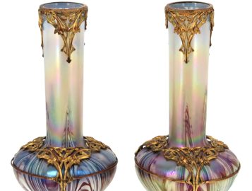 Paire de vases ART NOUVEAU en verre irisé à monture en métal doré à décor…