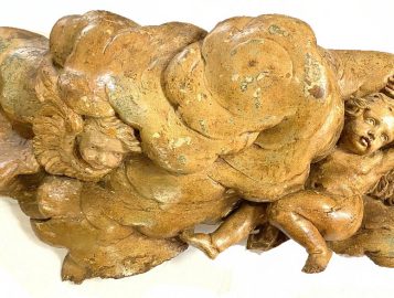 PANNEAU en bois naturel sculpté à décor d'angelots s'inscrivant dans des nuages. XVIIIème. (Qq fentes,…