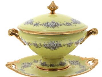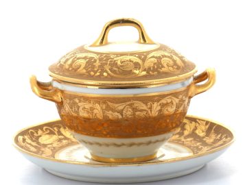 LE TALLEC Paris - Petit bouillon couvert et son plateau en porcelaine blanche et or,…