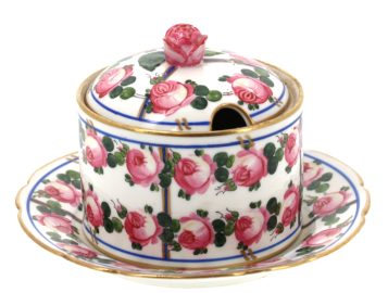 DELVAUX Paris - Sucrier ou confiturier couvert, sur plat servant, en porcelaine blanche, bleu et…
