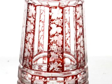 Vase en BOHEME transparent et rouge à décor de pampres de vigne. H 27 cm