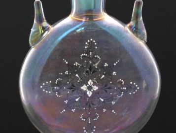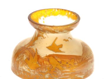 Vase miniature en verre décor d'oiseaux dans un paysage dans les tons ambrés vers 1900,…
