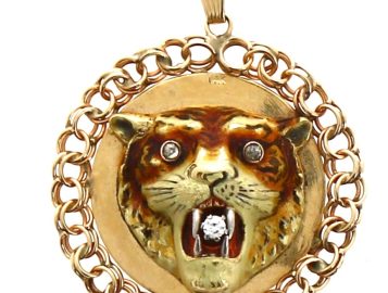 Pendentif en or jaune 14 cts à décor en relief d'une tête de tigre émaillée,…