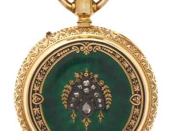 Montre de poche en or jaune 18 cts, émail vert et roses, cadran signé "Lacroix…