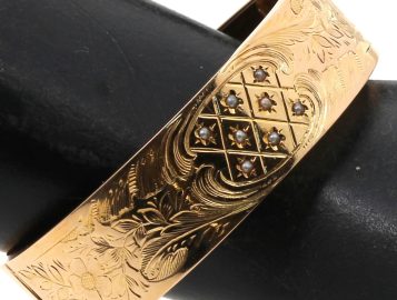 Bracelet jonc large ouvrant en or jaune 18 cts, agrémenté de 1/2 perles, poids 30,5…