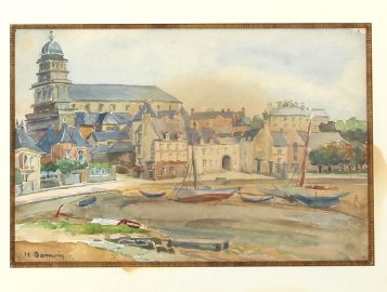 Henri Alphonse BARNOIN (1882-1940) "Bateaux à sec dans le port", aquarelle, signée bas gauche, 18,5…