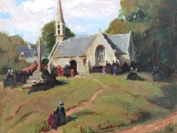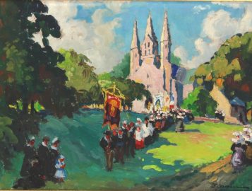 Pierre PLOUHINEC (1907-1984) "Pardon de Sainte Cécile à Briec", huile sur panneau d'isorel, signée bas…