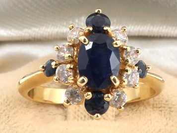 Bague en or jaune 18 carats, poinçon tête d'aigle, sertie d'un saphir ovale, 4 saphirs…