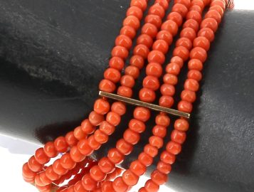Bracelet de 5 rangs de perles de corail, intercalaires et fermoir or jaune 18 cts.…