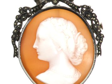Belle broche camée ancienne en argent, profil féminin, motif de nœud de ruban et marcassite,…